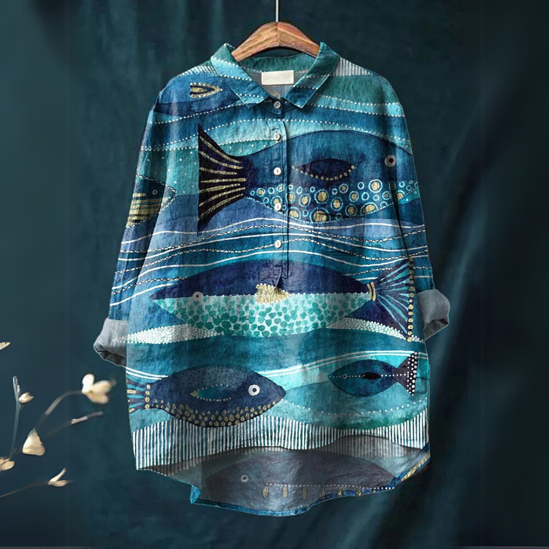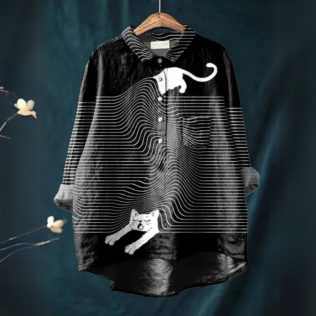 - Design: Einzigartiger Kunstdruck mit klassischem Kragen und über Hüfthöhe