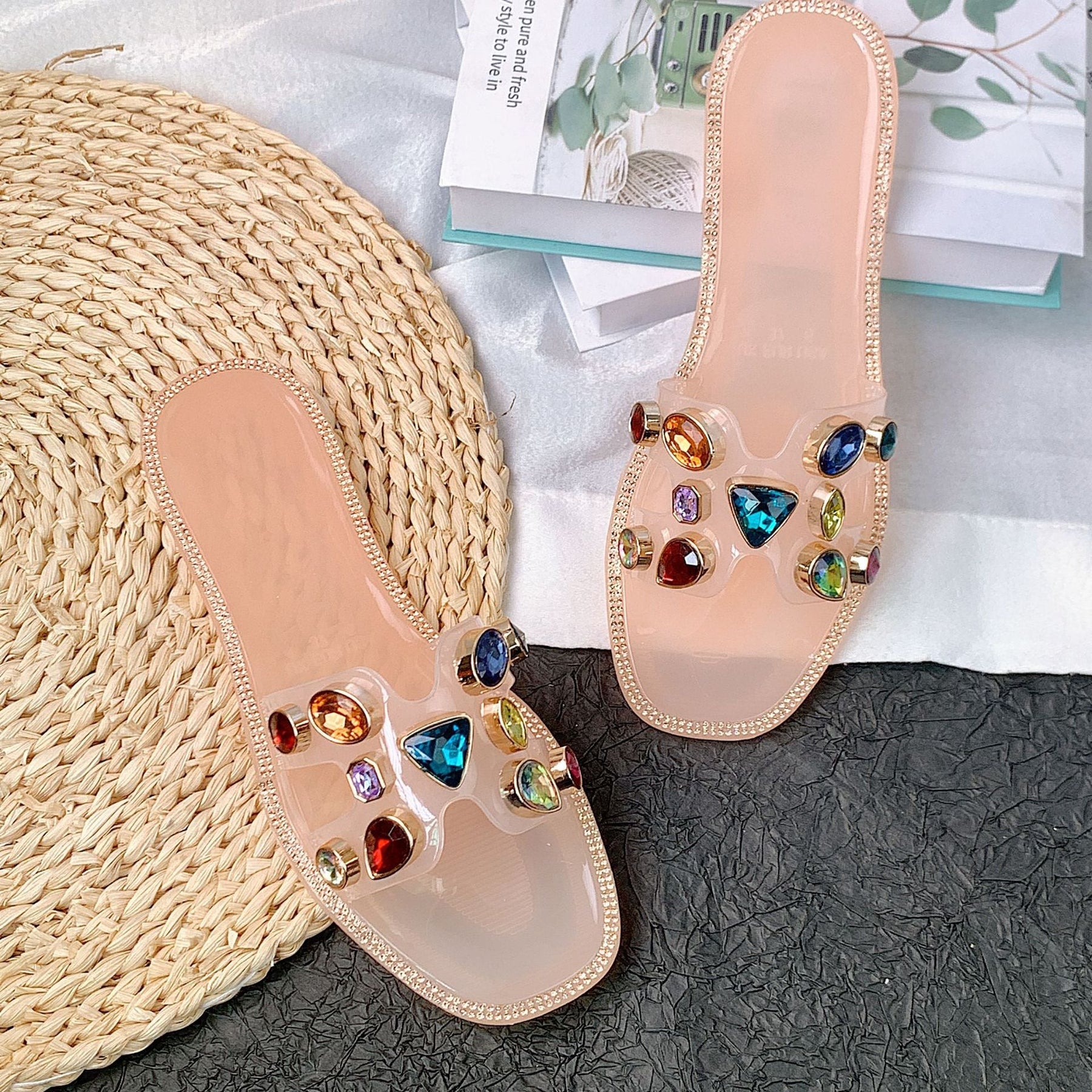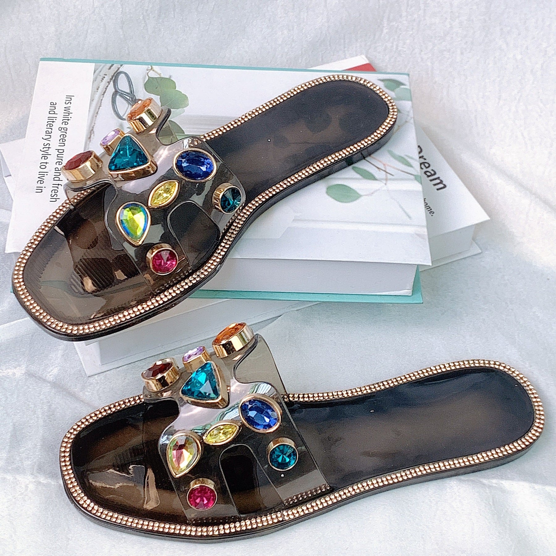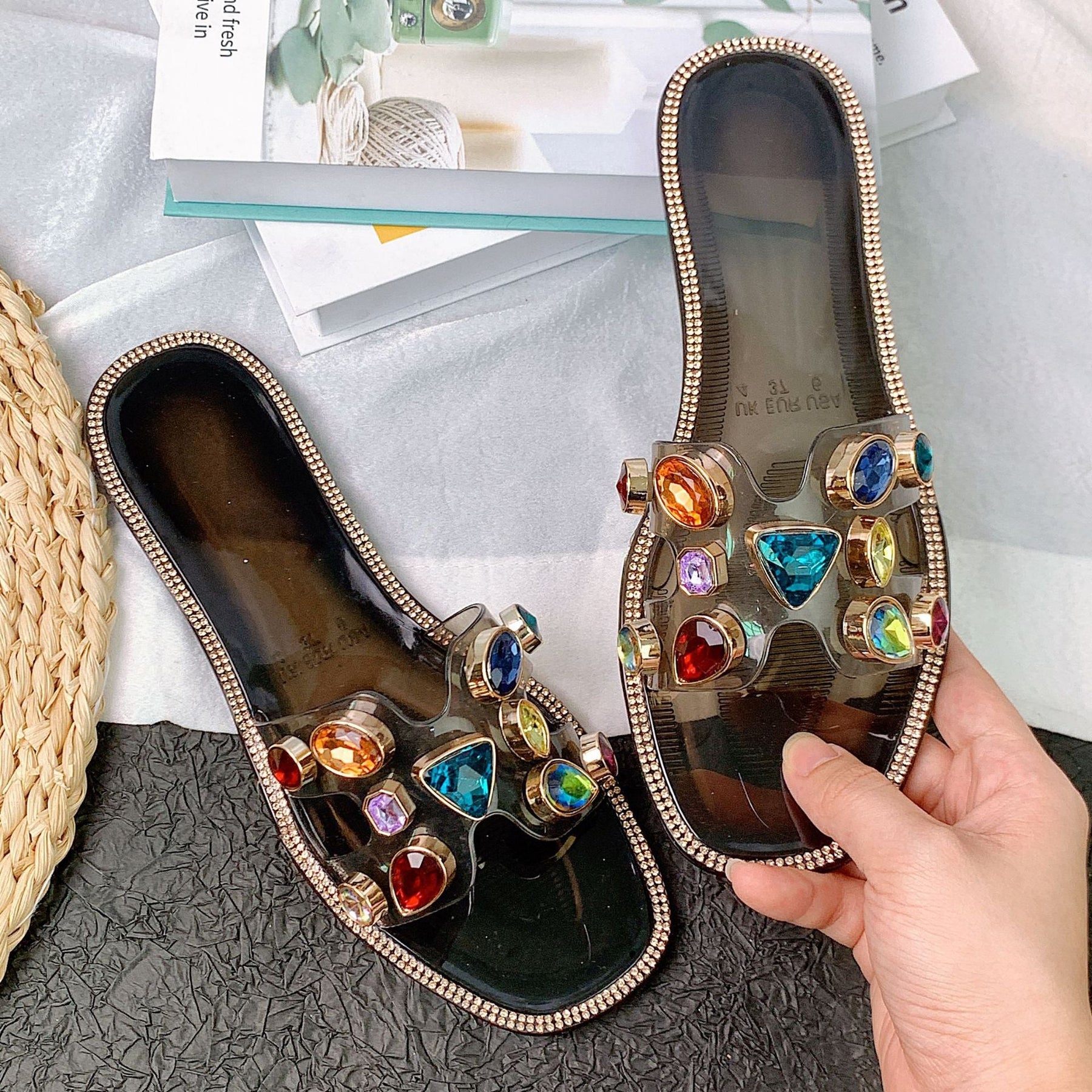 - Blickfangendes Design: Verziert mit funkelnden Schmucksteinen in verschiedenen Farben, verwöhnen diese Sandalen Ihre Füße und verleihen jedem Outfit das gewisse Etwas.