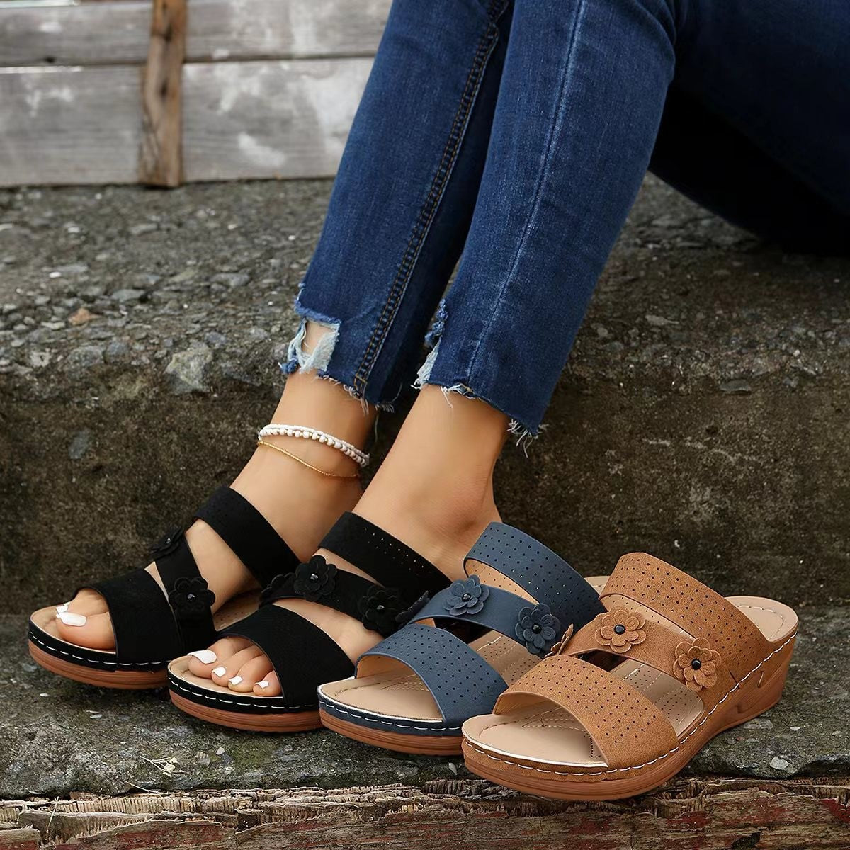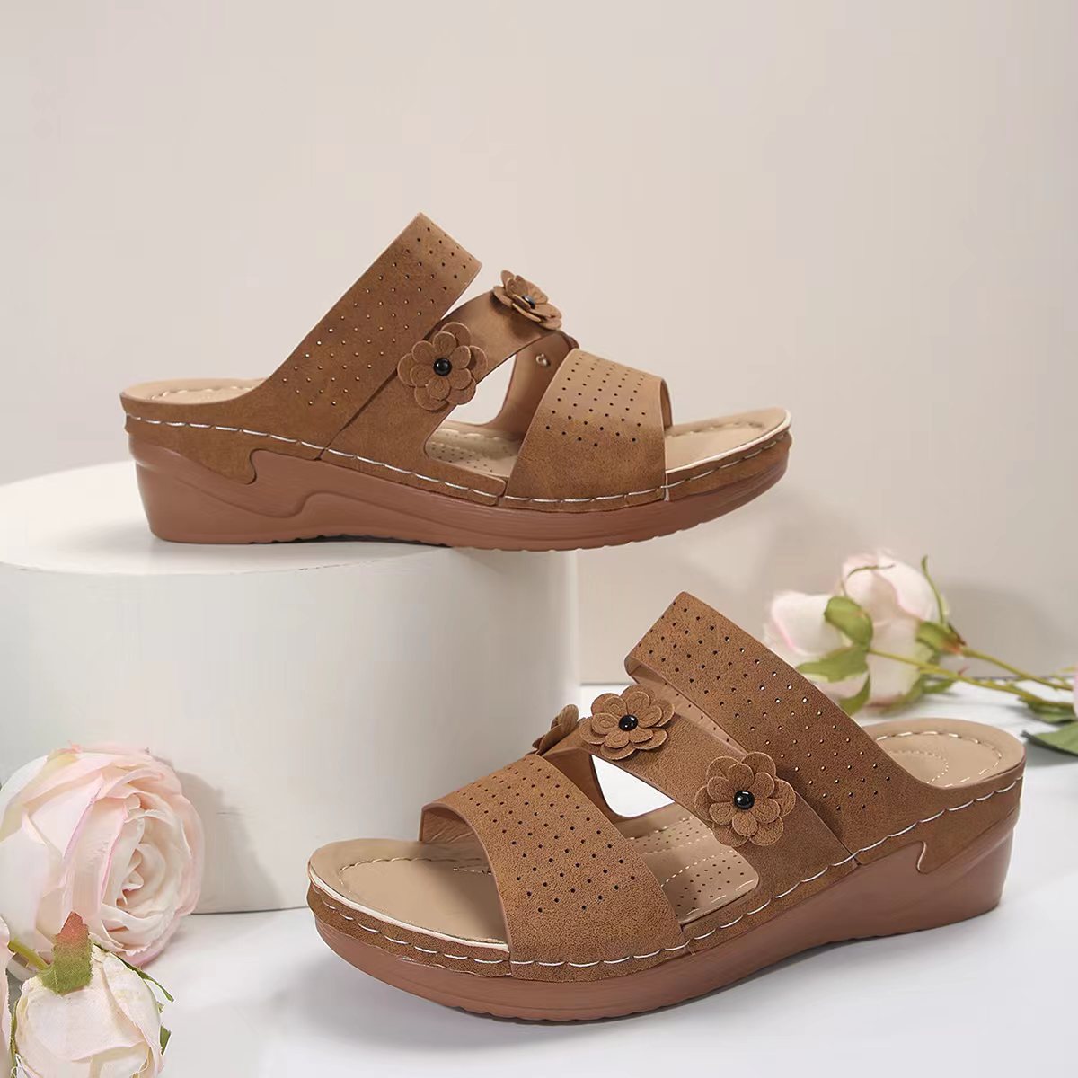 • Florale Verzierungen: Die liebevoll gestalteten Blumenapplikationen verleihen den Pantoletten eine feminine Note.