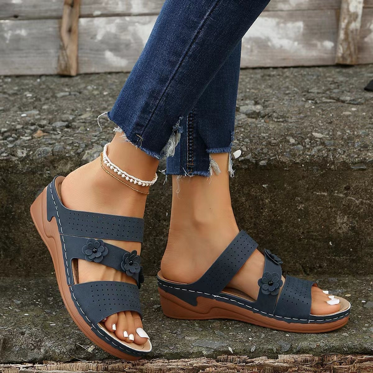 Damen Keil-Pantoletten mit floralen Akzenten und atmungsaktivem Obermaterial Fudus