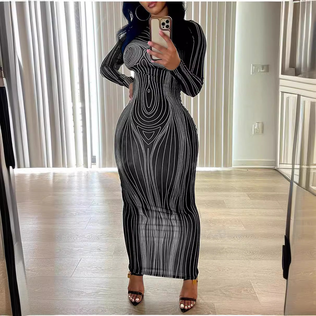 Entdecken Sie unser Damen langärmliges Maxikleid, das Eleganz und Stil vereint. Dieses atemberaubende Kleid ist mit einem einzigartigen strukturierten Linienmuster versehen, das Ihre Silhouette perfekt zur Geltung bringt.
