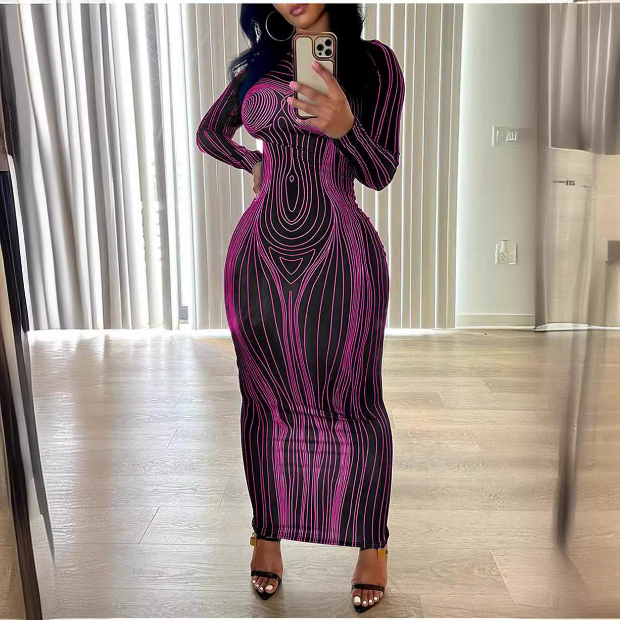 Damen Langärmliges Maxikleid mit strukturiertem Linienmuster und figurbetonendem Schnitt Fudus