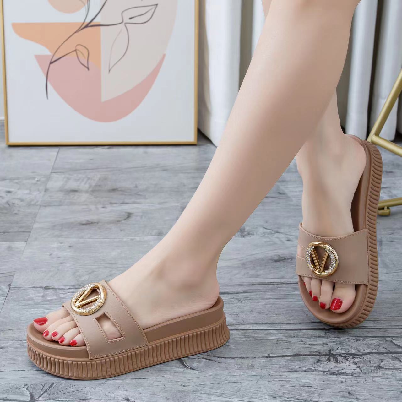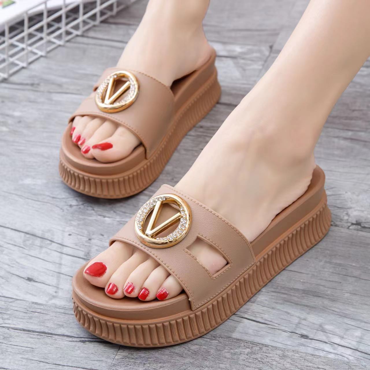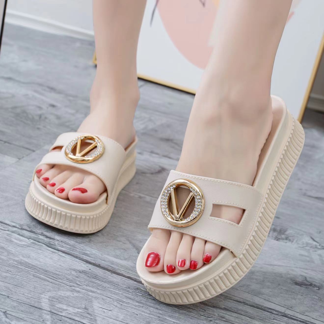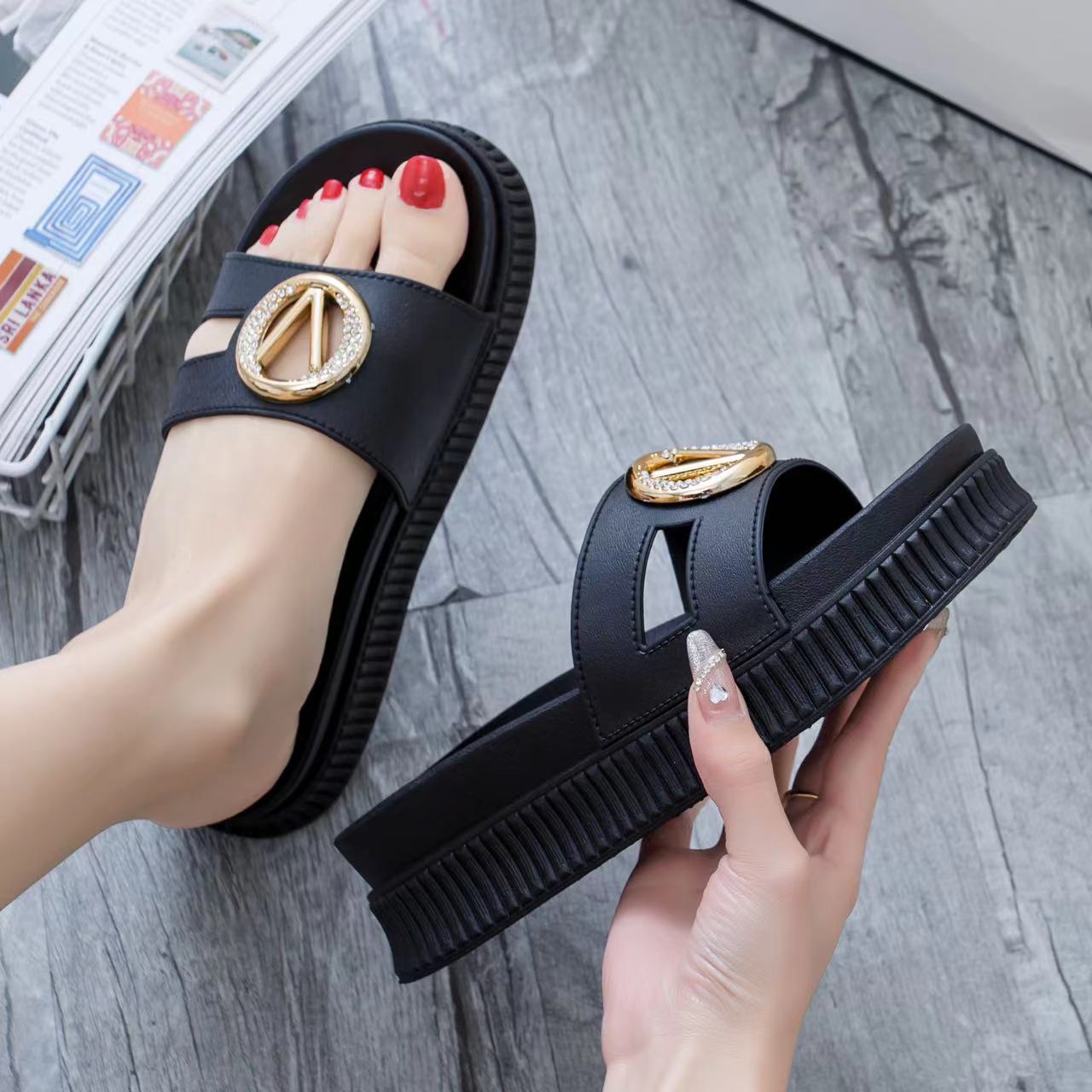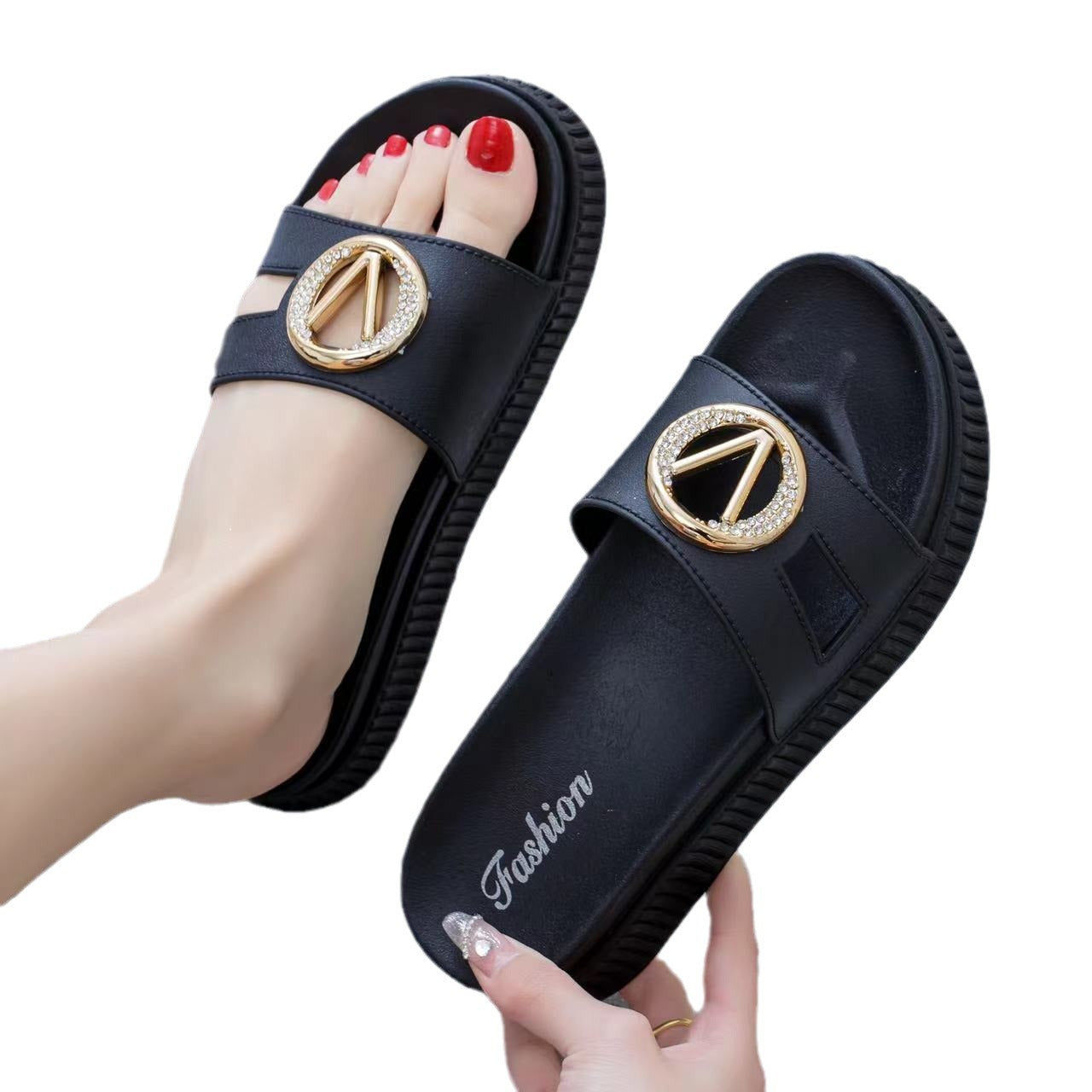 • Luxuriöser Schmuckdetail: Ein auffälliges, goldfarbenes Element mit funkelnden Akzenten macht diese Pantoletten zum Blickfang jeder Sommergarderobe.
