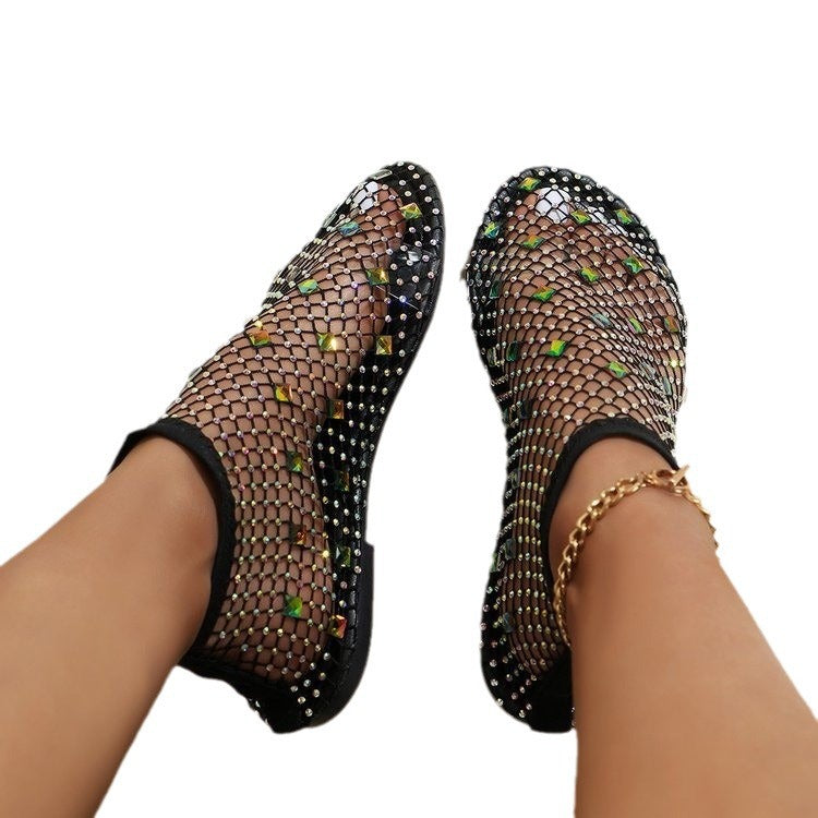 Damen Netz-Pantoletten mit bunten Strasssteinen und elastischem Material Fudus
