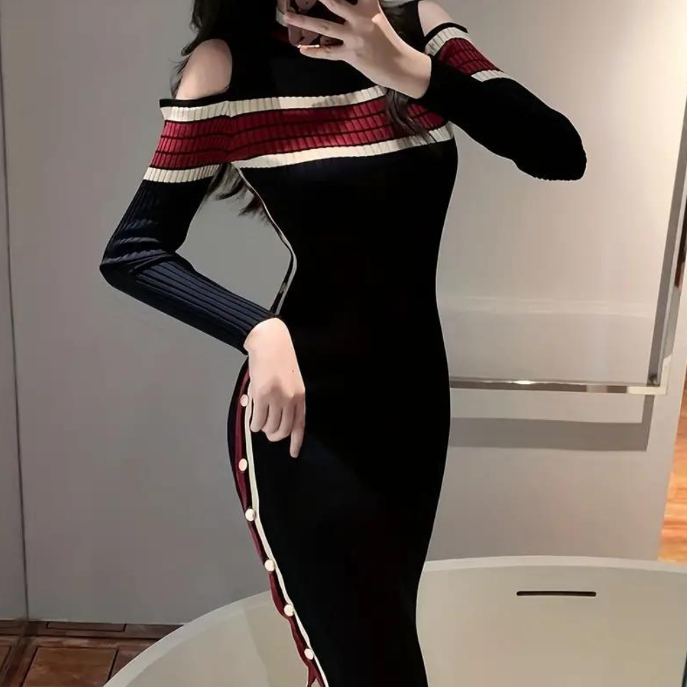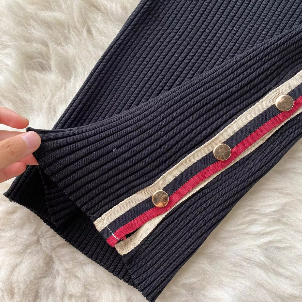 Dieses körperbetonte Strickkleid vereint feminine Eleganz mit sportlicher Raffinesse. Die gerippte Struktur betont die Silhouette, während die kontrastierenden Streifen und der markante Seitenschlitz mit Knopfleiste für einen einzigartigen Look sorgen. Perfekt für stilvolle Auftritte – ob im Alltag oder zu besonderen Anlässen.