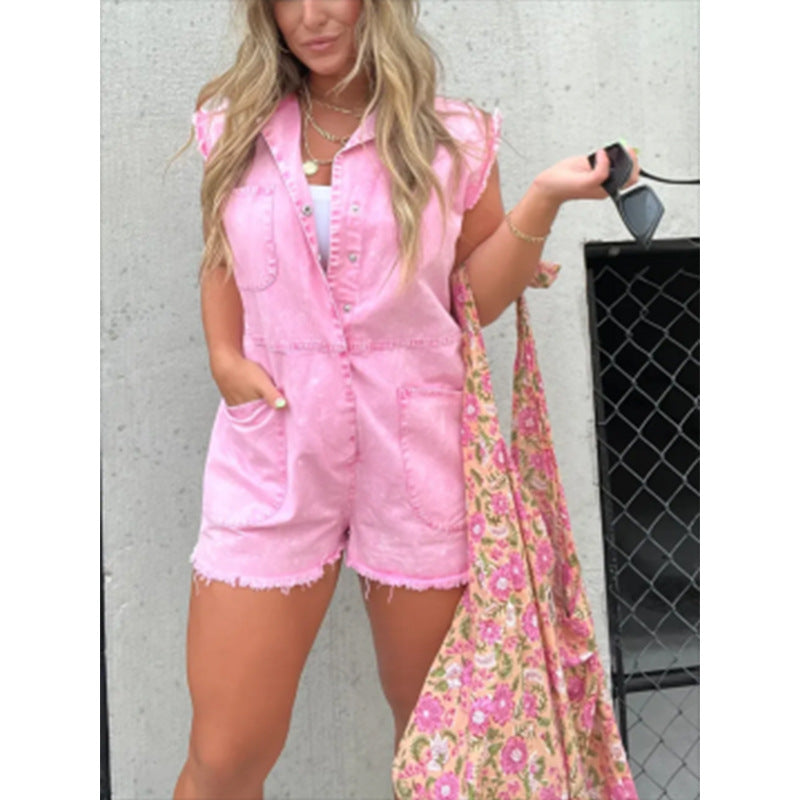 Damen trendiger Jeans-Overall mit Taschen und Kurzarm Fudus