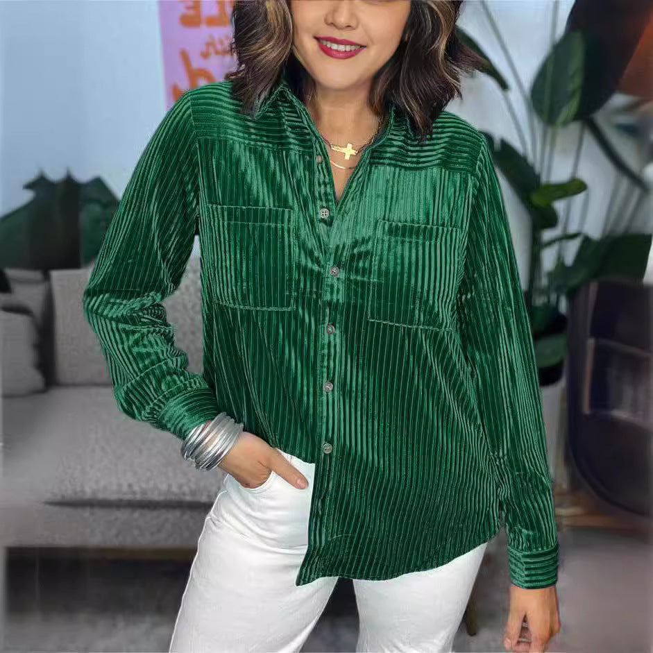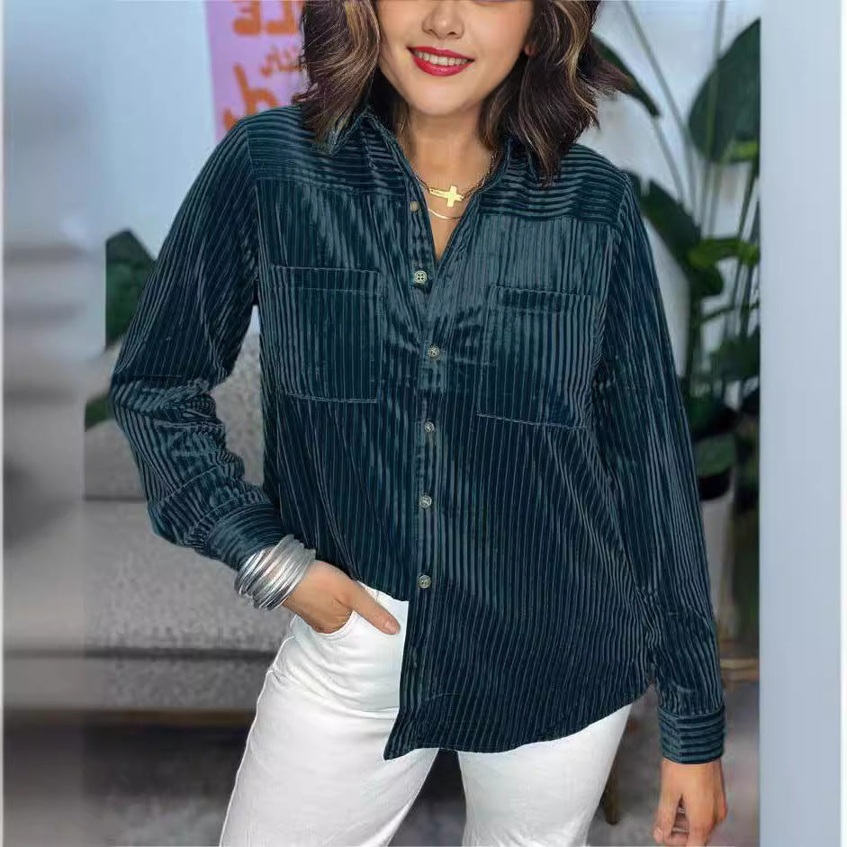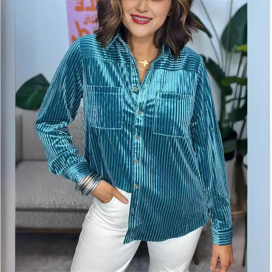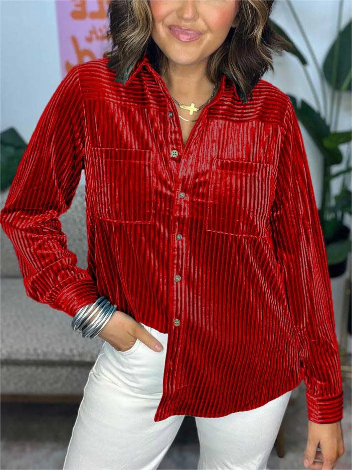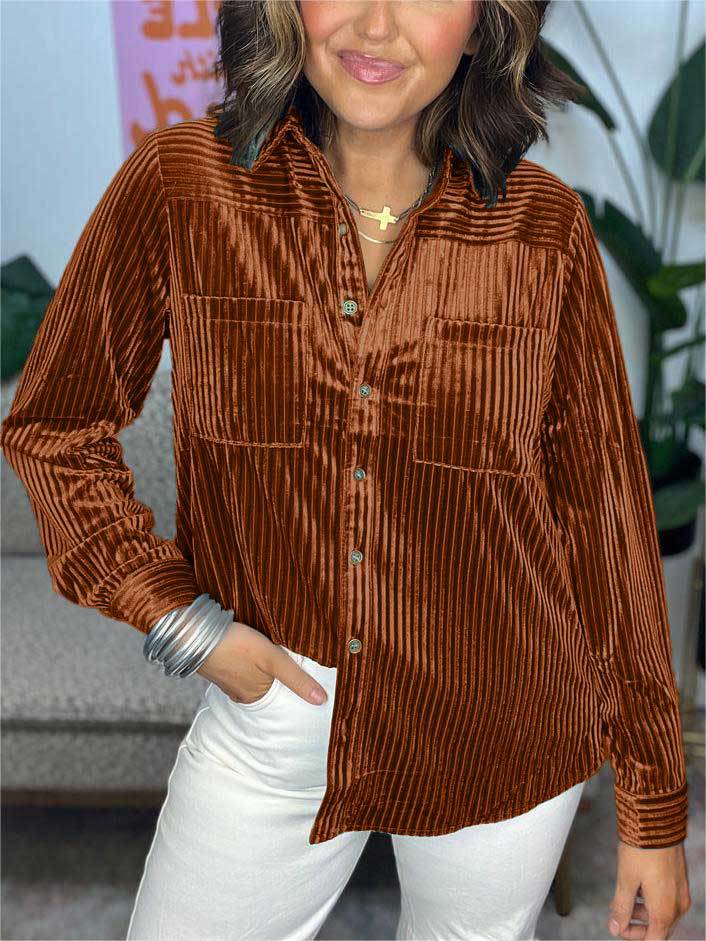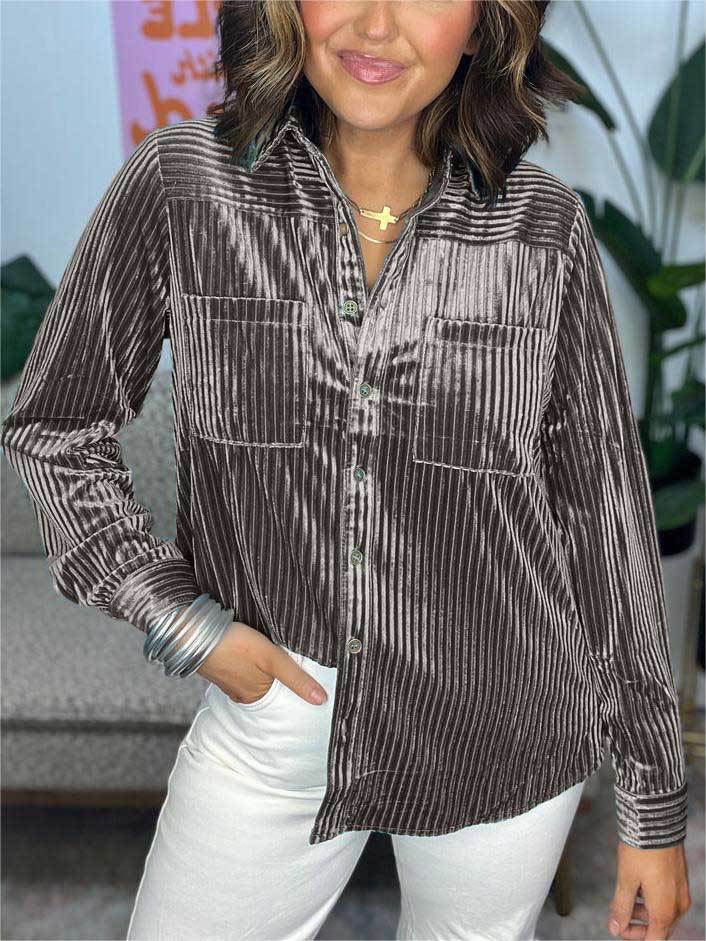 Damen Velours Hemd mit feinen Streifen und praktischen Taschen Fudus