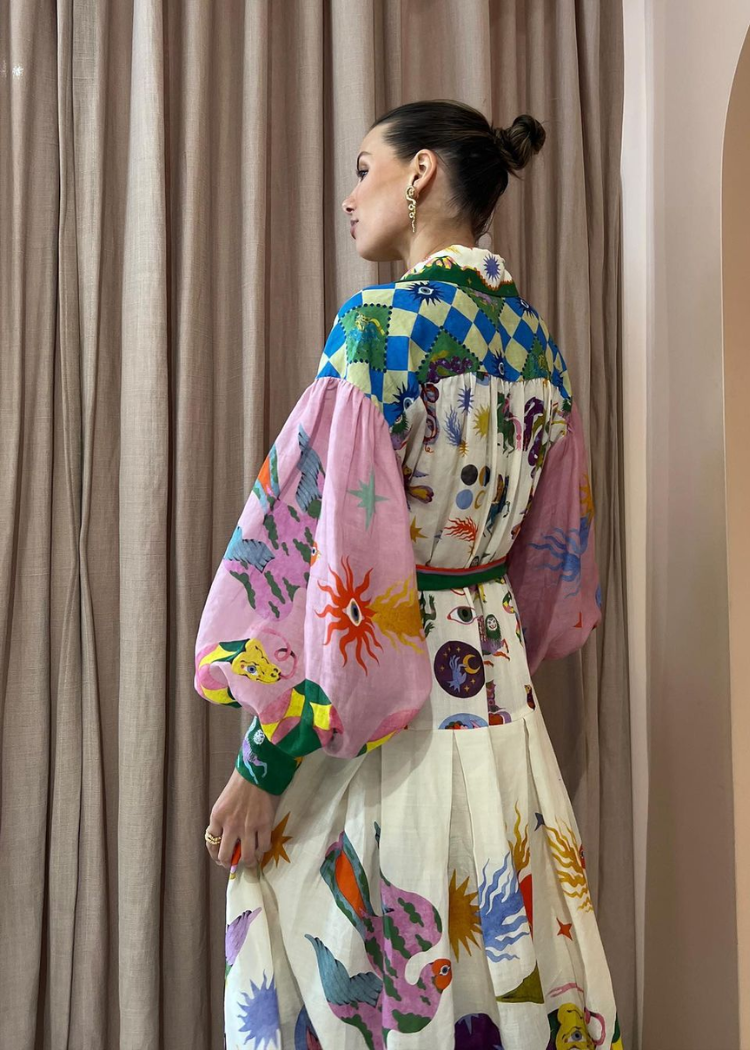 Dank des einzigartigen, farbenfrohen Musters fühlst du dich sofort besonders. Kein langweiliges Basic, sondern ein Kleid, das Energie ausstrahlt. -