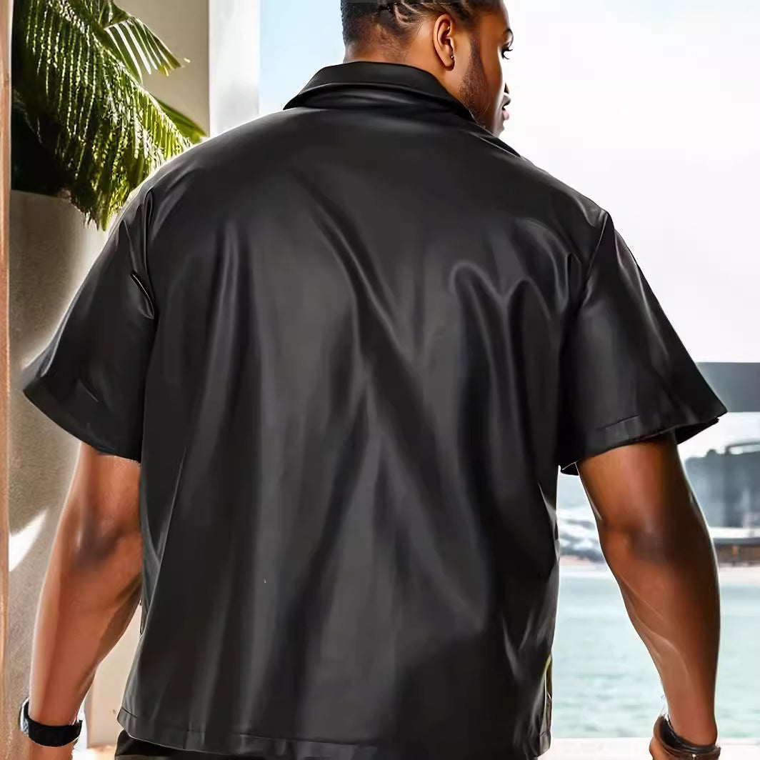 Herren lässige Kunstlederhemdjacke mit kurzem Arm und praktischen Reißverschlusstaschen Aliams