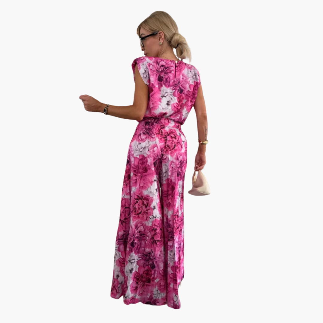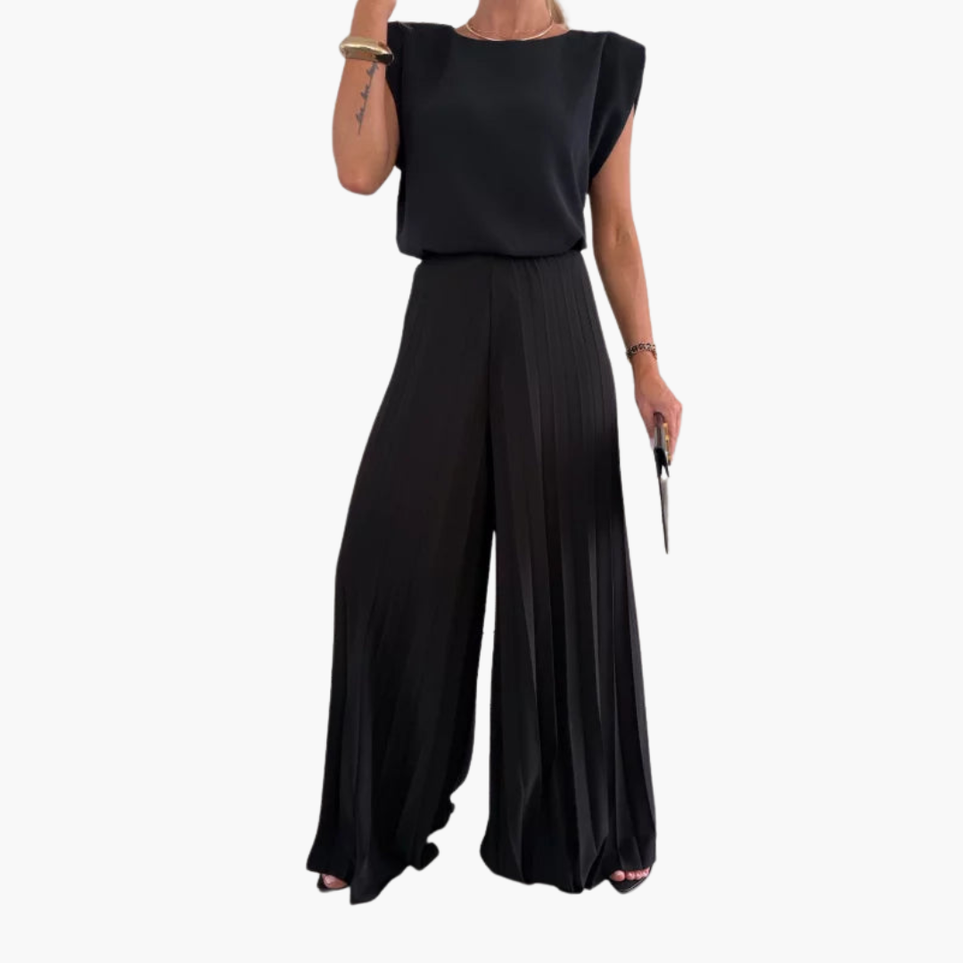 Das Ilona Elegante Zweiteiler-Set ist Ihre erste Wahl für mühelose Eleganz. Diese stilvolle Kombination aus einem ärmellosen V-Ausschnitt-Oberteil und weiten Hosen bietet einen schlanken, modernen Look, der perfekt für jede Gelegenheit ist. Hergestellt aus hochwertigem Stoff, sorgt es für eine schmeichelhafte Passform und hält Sie den ganzen Tag über bequem. Ob für einen lockeren Ausflug oder einen Abend in der Stadt, dieses vielseitige Set ergänzt verschiedene Stile und garantiert, dass Sie sich immer selbstbewusst und schick fühlen.