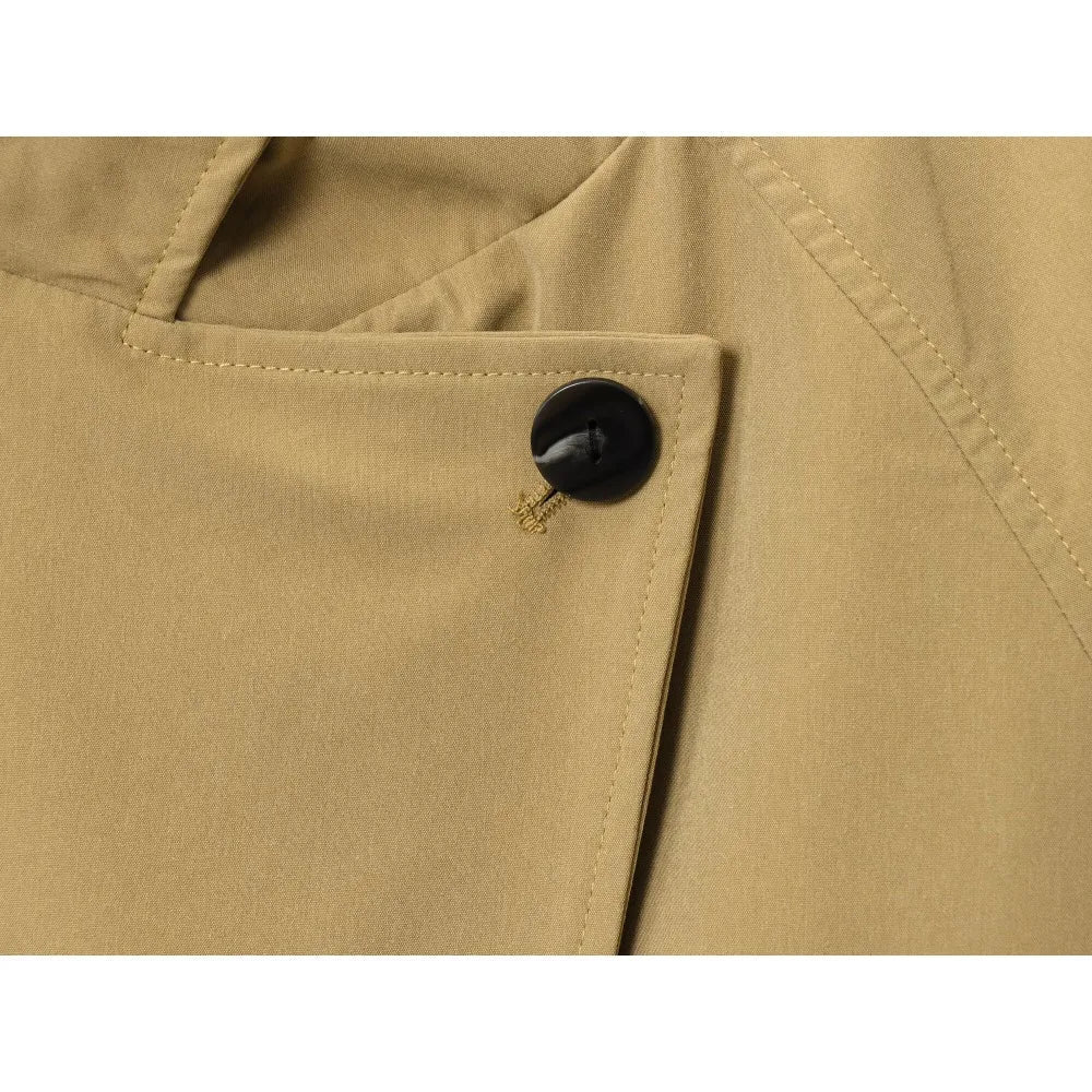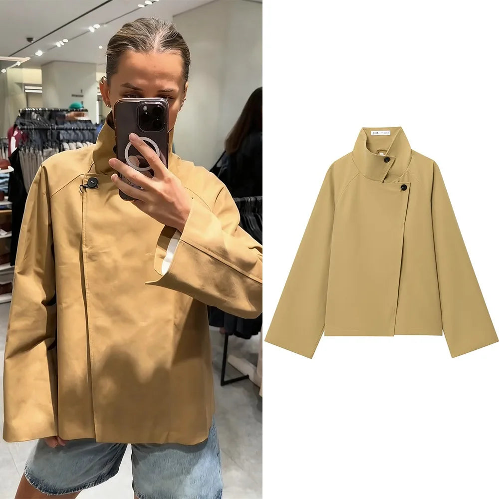 Diese kurze mantel verbindet minimalistisches design mit moderner lässigkeit. der hohe stehkragen und die saubere front sorgen für einen klaren, eleganten look. die lockere passform lässt sich leicht layern und passt zu denim, tailoring und city-outfits. ideale wahl für „stehhkragen mantel damen“, „oversize mantel“ und „minimal chic“.
