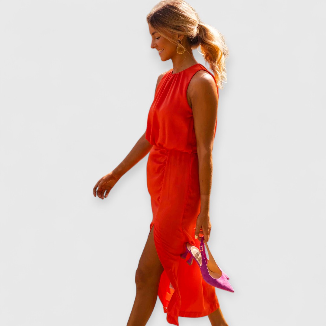 Wir präsentieren unser meistverkauftes Liene Midi Kleid, die perfekte Kombination aus Komfort und Eleganz für die warmen Tage, an denen Sie mühelos schick aussehen möchten. Dieses atemberaubende Stück schmeichelt jeder Figur, ohne einzuengen, und bietet einen eleganten hohen Ausschnitt sowie ein ärmelloses Design, das moderne Anmut ausstrahlt.