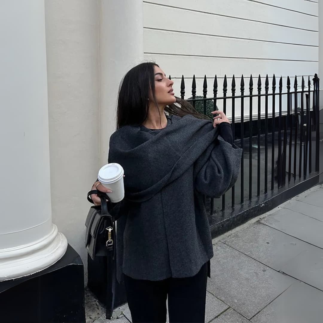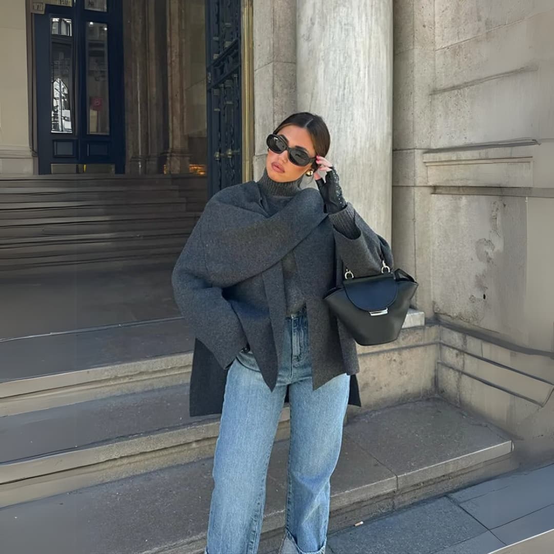 Dieser atemberaubende Cape-Mantel hebt Ihren Look mit seiner schlanken Passform und eleganten Drapierung hervor und hüllt Sie den ganzen Tag in gemütlichen Komfort. Perfekt für jeden Ausflug stellt er sicher, dass Sie bereit sind, den Tag mit Stil und Selbstvertrauen zu meistern.