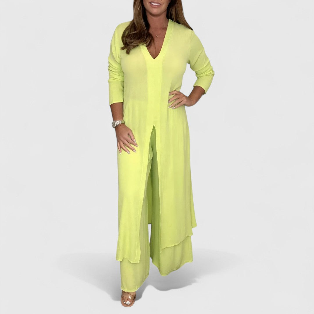 Bereit, deine Frühlingsgarderobe aufzuwerten? Unser beliebtes Zweiteiler-Outfit Margherita wurde für alle entworfen, die Komfort lieben, ohne auf Stil zu verzichten. Dieses schicke Ensemble vereint mühelose Eleganz mit einem frischen Look, der dich in dieser Saison strahlen lässt!