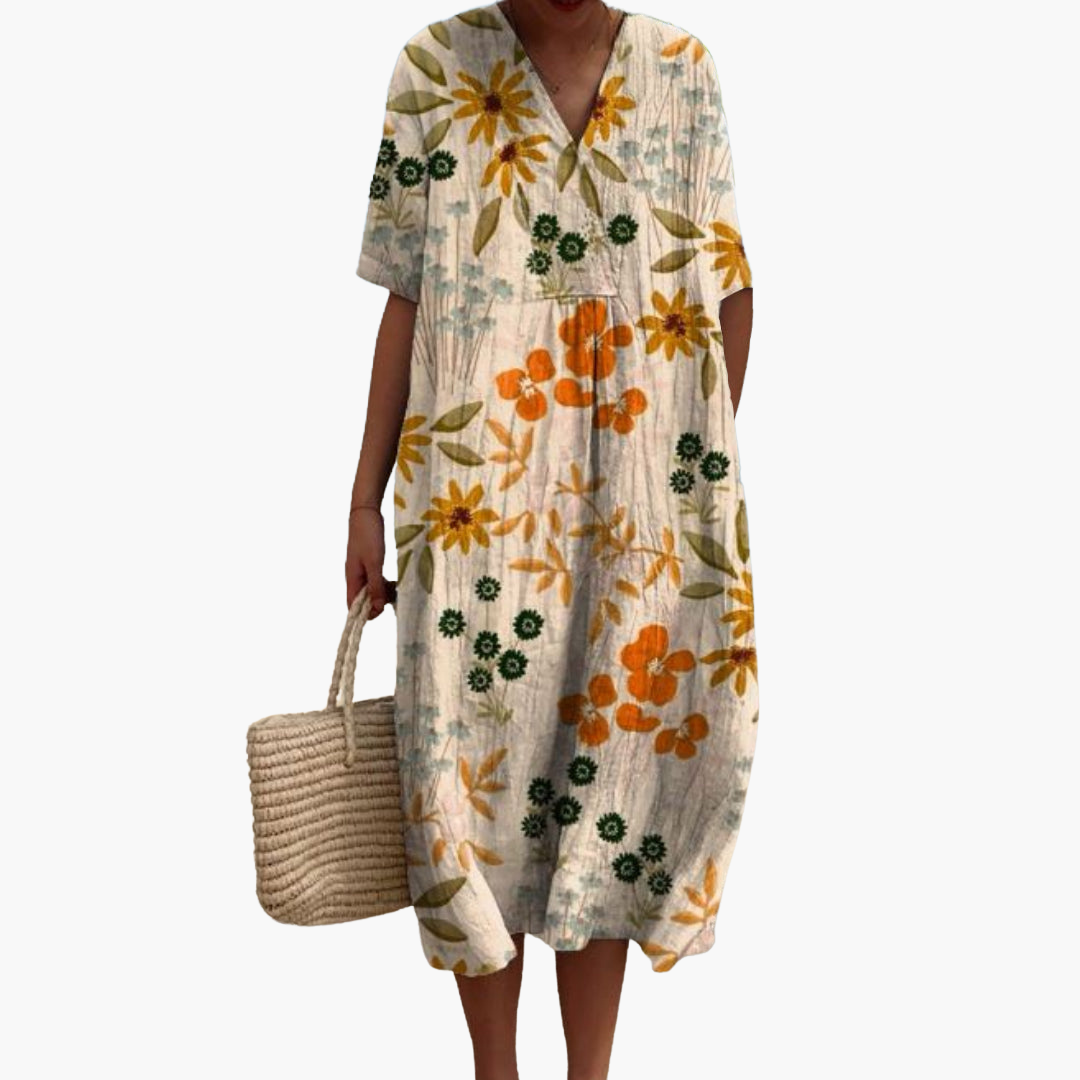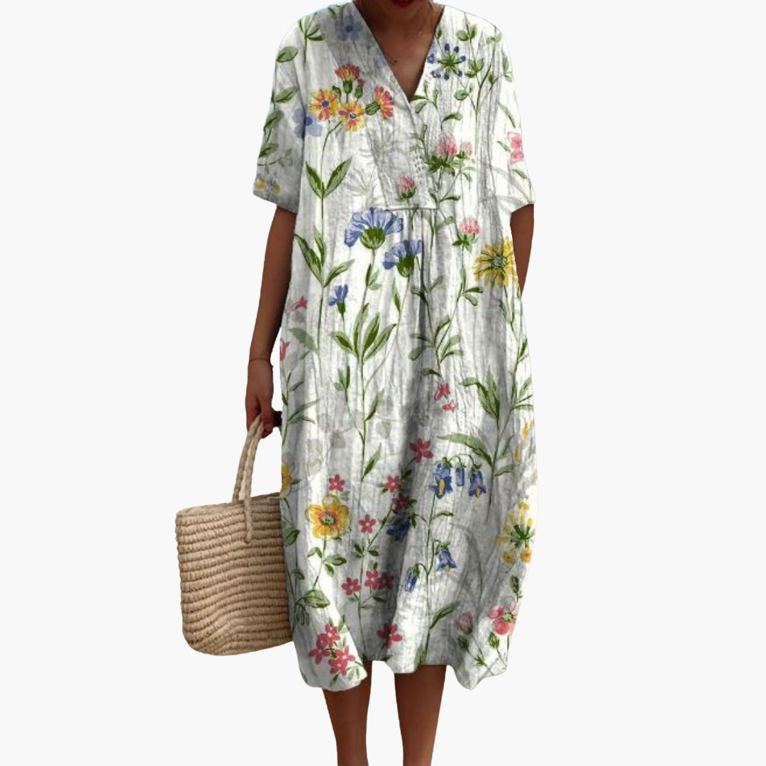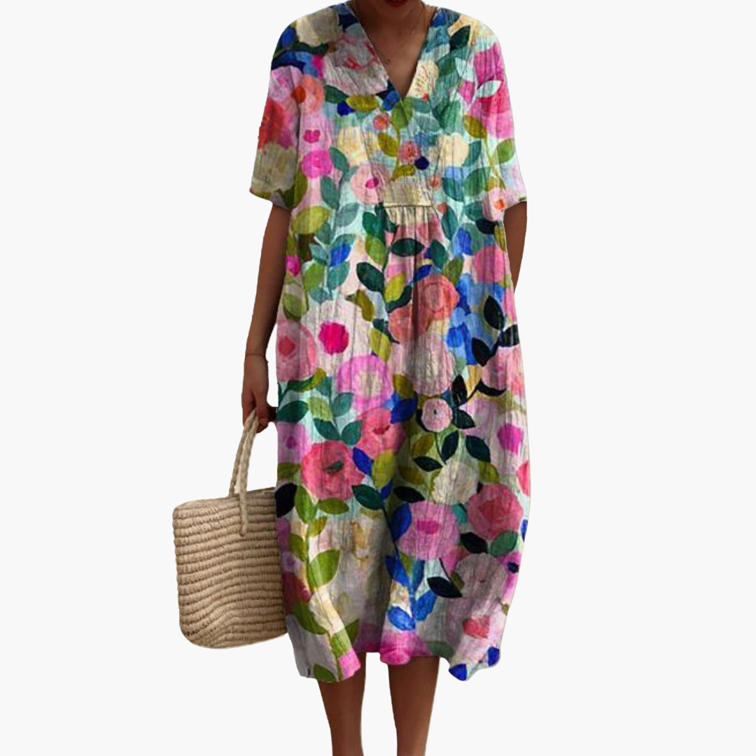 Tauche ein in die Welt femininer Leichtigkeit mit diesem farbenfrohen Sommerkleid. Der florale Print sorgt für gute Laune, während der luftige Schnitt ein angenehmes Tragegefühl garantiert. Perfekt für warme Tage – ob am See, beim Brunch oder auf einer Sommerparty – dieses Kleid verleiht dir Stil und Selbstvertrauen.