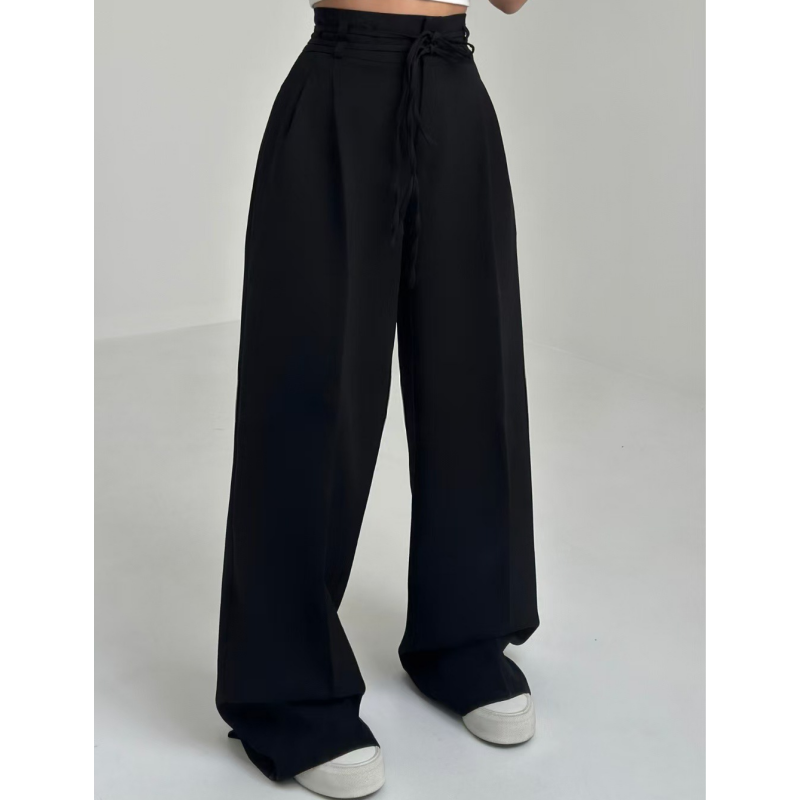 Diese weit geschnittene Hose überzeugt durch ihren hohen Bund mit dekorativer Schnürung und ihre fließende Silhouette. Der lockere Fall des Stoffes verleiht jedem Schritt eine stilvolle Leichtigkeit, während der hohe Sitz die Figur betont und gleichzeitig bequem bleibt. Ideal für stilvolle Alltagslooks oder elegante Casual-Outfits.